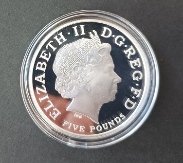 Moeda lançada em 2011, cunhada em Prata, acabamento Proof Piedfort, com o valor facial de £5, cinco Libras.