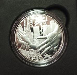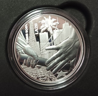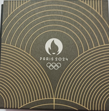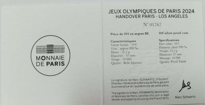 Moeda de 10€ Proof , com 0,999 em prata, com um peso de 22,2 gr e diâmetro de 37mmm. Passagem do testemunho olímpico Paris/ Los Angeles.