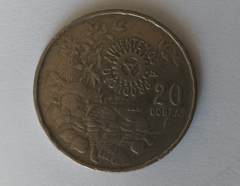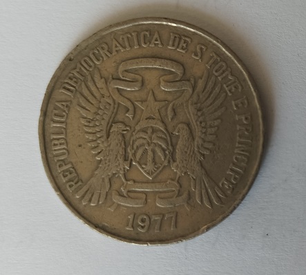 Esta moeda de 20 dobras  de 1977 é de circulação normal em S. Tomé e Príncipe com 29 mm de diâmetro. Bordo serrilhado