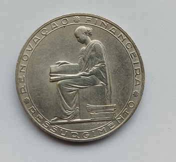 A moeda de 20 escudos de 1953 da República Portuguesa, comemora os 25 anos do ressurgimento renovação financeira.