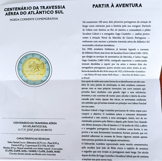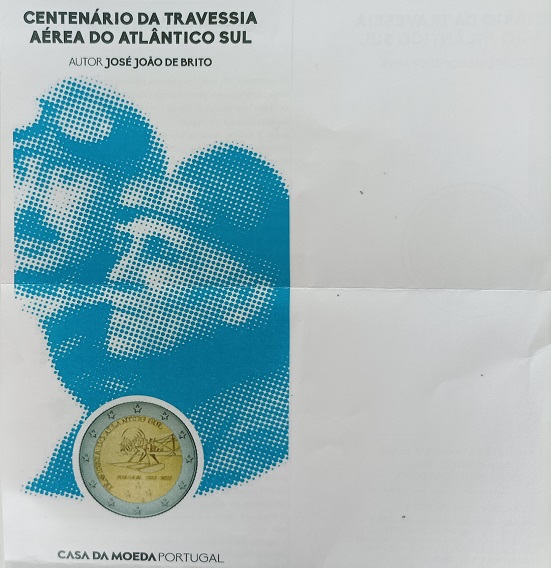 Moeda de 2€ comemorativa do centenário da travessia aérea do Atlântico sul. Moeda Oferecida pela LusoFly Academy.
