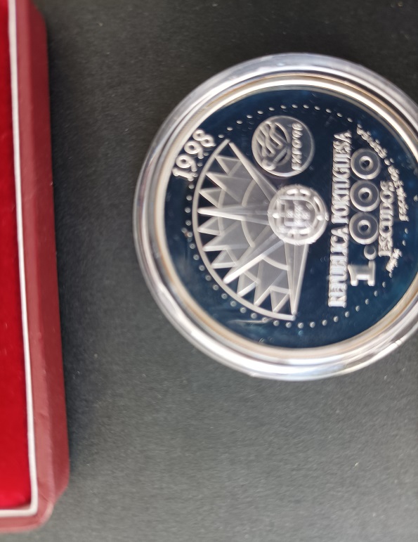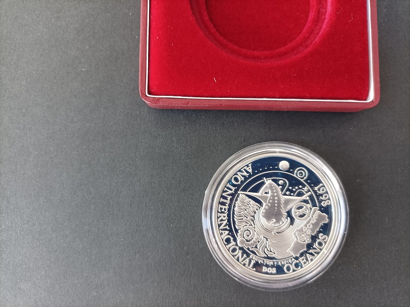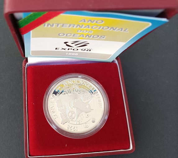 Reverso: Apresenta dois astrolábios e uma forma triangular, que sugere uma vela de barco; dentro do astrolábio maior está representada a constelação Ursa Menor com a Estrela Polar; representações do mar, de um barco com velas e de outro sem velas, do mapa de Portugal, dentro do qual está o símbolo e logótipo da EXPO 98, e de um cavalo marinho; na cercadura a legenda «Ano Internacional dos Oceanos» e a data.