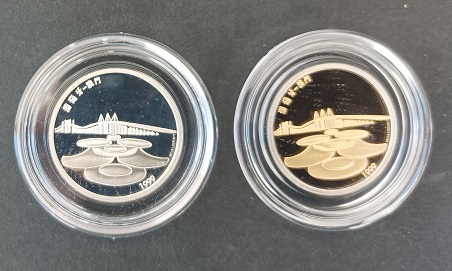 Anverso: apresenta a ponte que liga a península à ilha de Taipa, tendo por mar a representação da calçada portuguesa de uma rua de Macau e, em caracteres chineses, a legenda «Macau-Portugal».