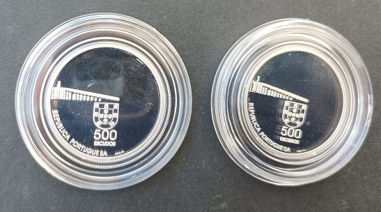 Reverso: apresenta a continuação da ponte representada no anverso, o escudo nacional, a legenda «República Portuguesa» e o valor facial de 500$.