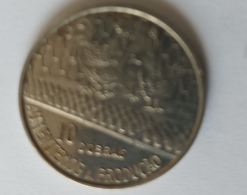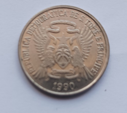 Moeda redonda com alinhamento a 0º de 10 dobras de 1990. É de circulação normal em S. Tomé e Príncipe.