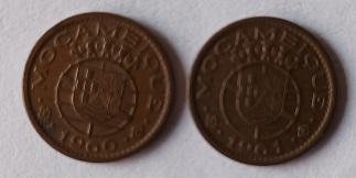 Moedas de 10 centavos da colónia portuguesa do ano 1960 e 1961. Moeda em bronze lisa e redonda, 1,7 gr de peso, 16 mm de diâmetro e 1,15 de espessura.
