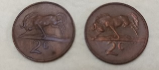 Moedas de 2 cêntimos da Africa do Sul de 1965 e 1971, Ambas em bronze e de circulação normal