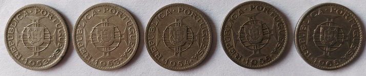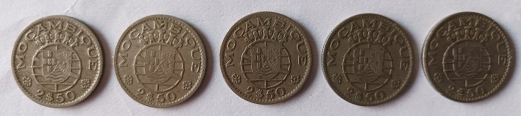 Estas moedas apresentam no anverso o brasão; 2$50; Moçambique. No reverso o brasão e república Portuguesa e correspondem ás seguintes datas 1952, 1953, 1954, 1955, 1965.