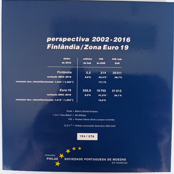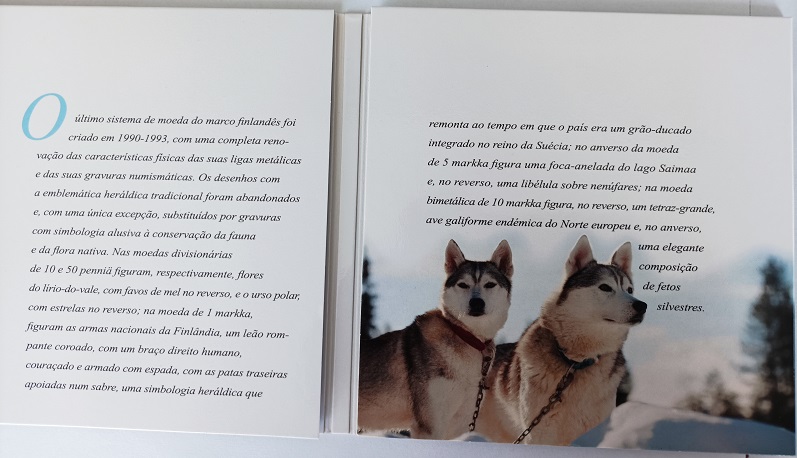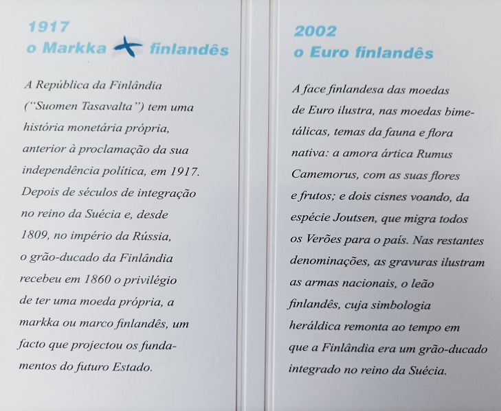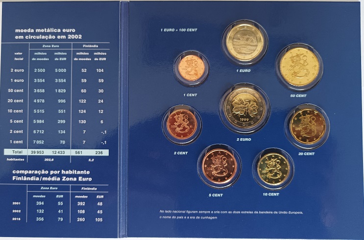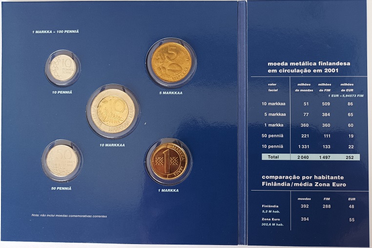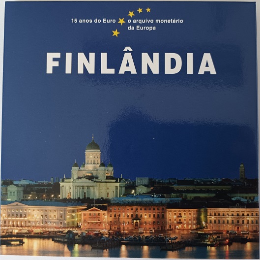este estojo faz parte de uma coleção de moedas dos países pertencentes à união monetária europeia. Este estojo de moedas finlandesas contem euros finlandeses e a antiga moeda comporto por marcos finlandeses e as frações denominadas de penniã.