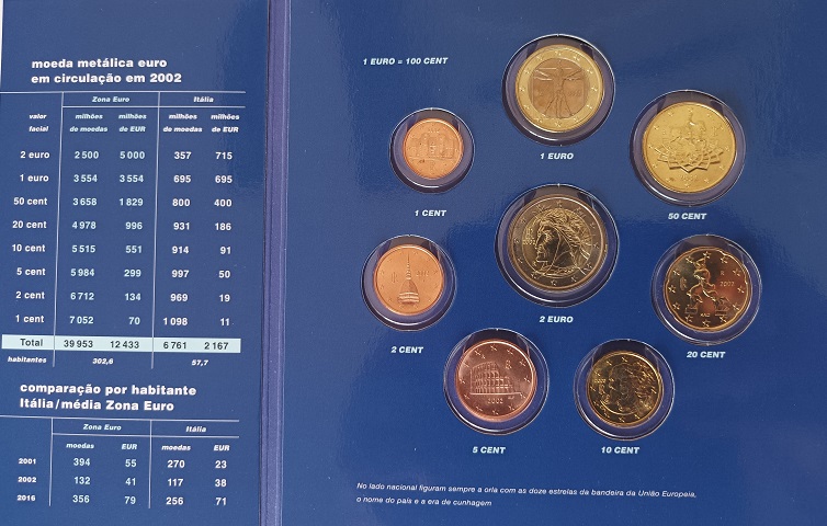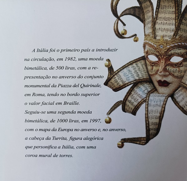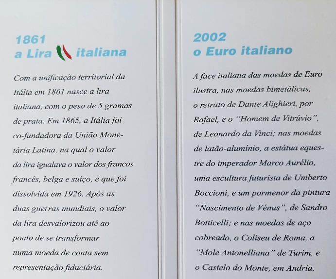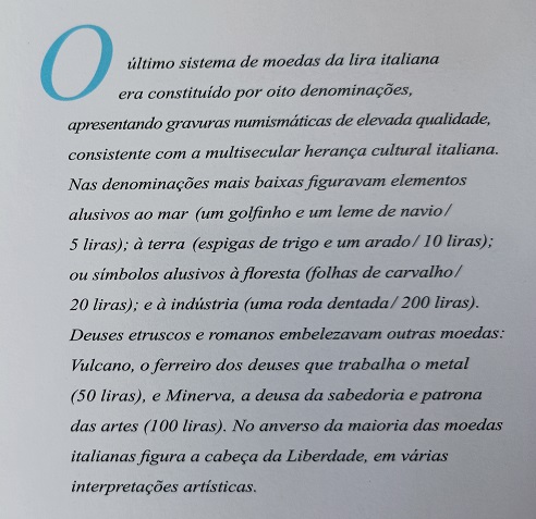 Itália, país multicultural que representa nas suas moedas toda a sua atividade histórica e atual. Elementos alusivos ao mar a moeda de 5 liras representa um golfinho e um leme de um navio. elementos alusivos à terra na moeda de 10 liras as espigas de trigo e um arado, nas de 20 liras símbolo da floresta com folhas de carvalho, a industria na moeda de 200 liras com uma roda dentada. A moeda de 500 liras no seu anverso do conjunto monumental da Piazza del Quirinale é uma moeda de braille no seu valor facial. A de mil liras emitida em 1997 no anverso com o mapa da europa e a cabeça da Turrila, uma figura que personifica o país italiano, com uma coroa mural de torres.