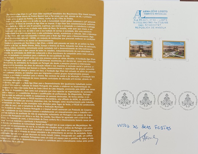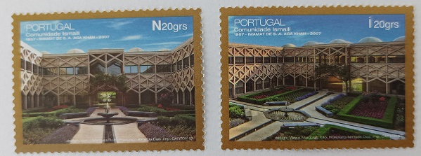 Dois selos que retratam a arquitetura da Comunidade Ismaili em Portugal.