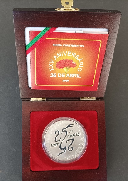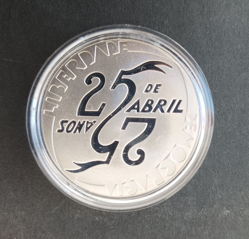 Anverso: Inscrevem-se no rebordo as palavras «LIBERDADE» e «DEMOCRACIA»; no campo abrem-se as palavras «25 de Abril» e «25 Anos», num jogo gráfico em que os cincos se unem, provocando uma dupla leitura na rotação da moeda. Estas palavras, polidas e brilhantes, aparecem com grande força, contrastando com o campo e o rebordo, que se apresentam foscos.